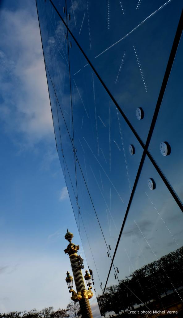 La ConcordeLundi 2 Novembre 2015 Elle porte bien son nom la place de la Concorde, au sortir du jardin des Tuileries, les differentes epoques se côtoient de l'obélisque à ce cube de verre de l expo Saint Gobain qui préfigure l'habitat de demain.